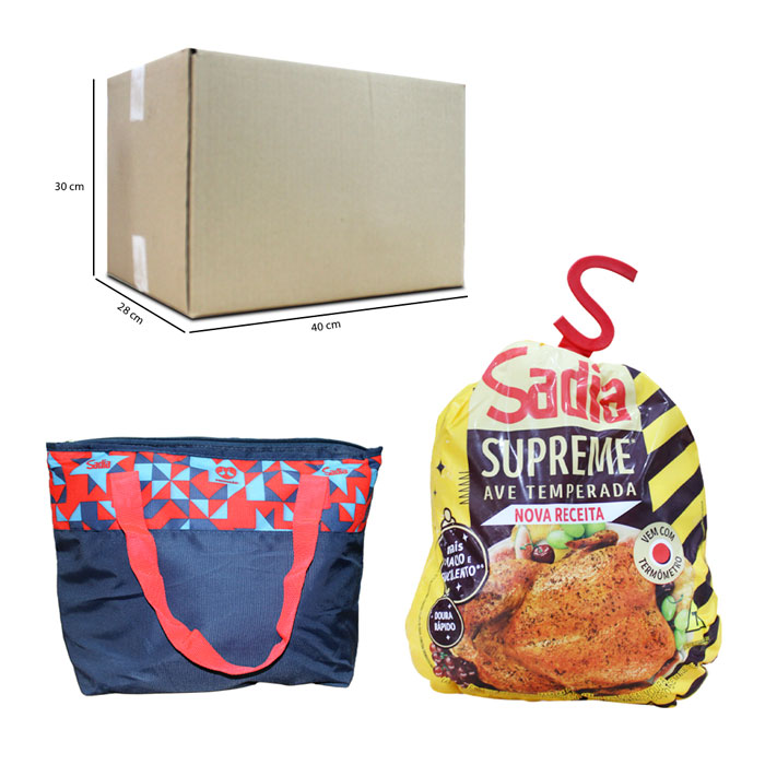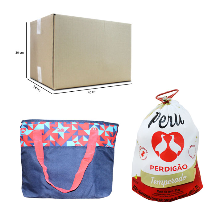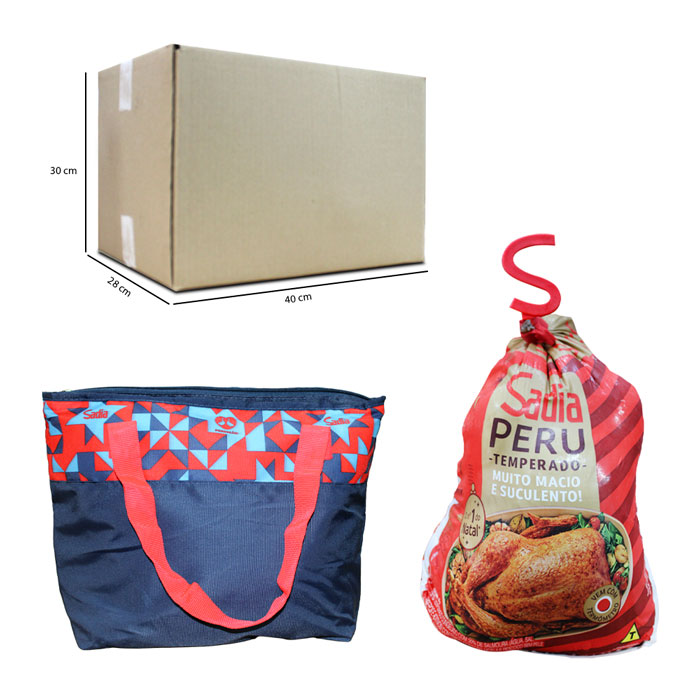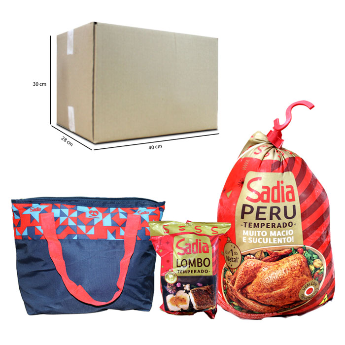 A CESTA SADIA VITORIA / CAIXA COM 2 CESTAS / CADA CESTA COM 1 BOLSA E 1 PERU TEMPERADO SADIA