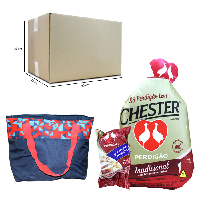 A CESTA PERDIGAO FELICIDADE / CAIXA COM 2 CESTAS / CADA CESTA COM 1 BOLSA E 1 CHESTER PERDIGAO